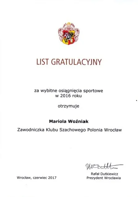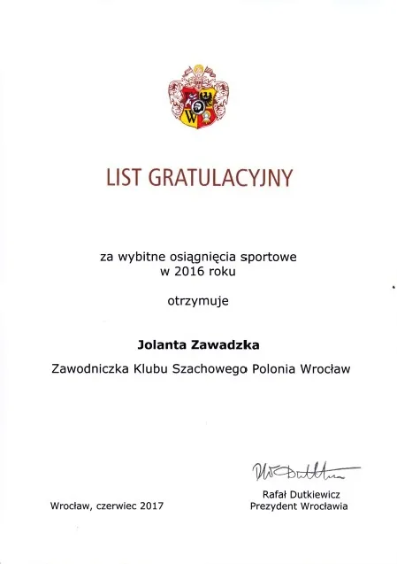 Do naszego klubu dotarły oficjalne listy gratulacyjne od Prezydenta Wrocławia pana Rafała Dutkiewicza, skierowane do szachistek Polonii: Jolanty Zawadzkiej i Marioli Woźniak, za wybitne osiągnięcia sportowe w 2016 roku!