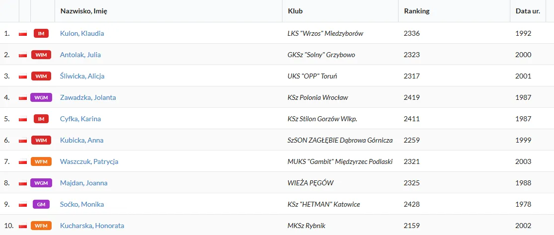 Dzisiaj w Ostrowie Wielkopolskim rozpoczynają się Indywidualne Mistrzostwa Polski Kobiet w których startuje Jolanta Zawadzka! W Ostrowie Wielkopolski rozpoczynają się dzisiaj 72. Indywidualne Mistrzostwa Polski Kobiet, które potrwają do przyszłej środy (12.08.2020). W mistrzostwach zagra 10 zawodniczek (turniej kołowy, każdy z każdym) w tym zawodniczka naszego klubu Jolanta Zawadzka! Dla Joli będzie to już dziewiętnasty finał Mistrzostw Polski Kobiet :) Do tej pory polonistka zdobyła 13 medali (4x złoto, 5x srebro, 4x brąz) i liczymy, że w tegorocznych mistrzostwach zdobędzie 14 medal (najlepiej złoty). Jola w pierwszej rundzie zagra białym kolorem z Patrycją Waszczuk. Rundy rozpoczynają się o godz. 16:00, poza ostatnią, która rozpocznie się o godz. 14:00. Strona mistrzostwa - TUTAJ Lista startowa po losowaniu numerów startowych.