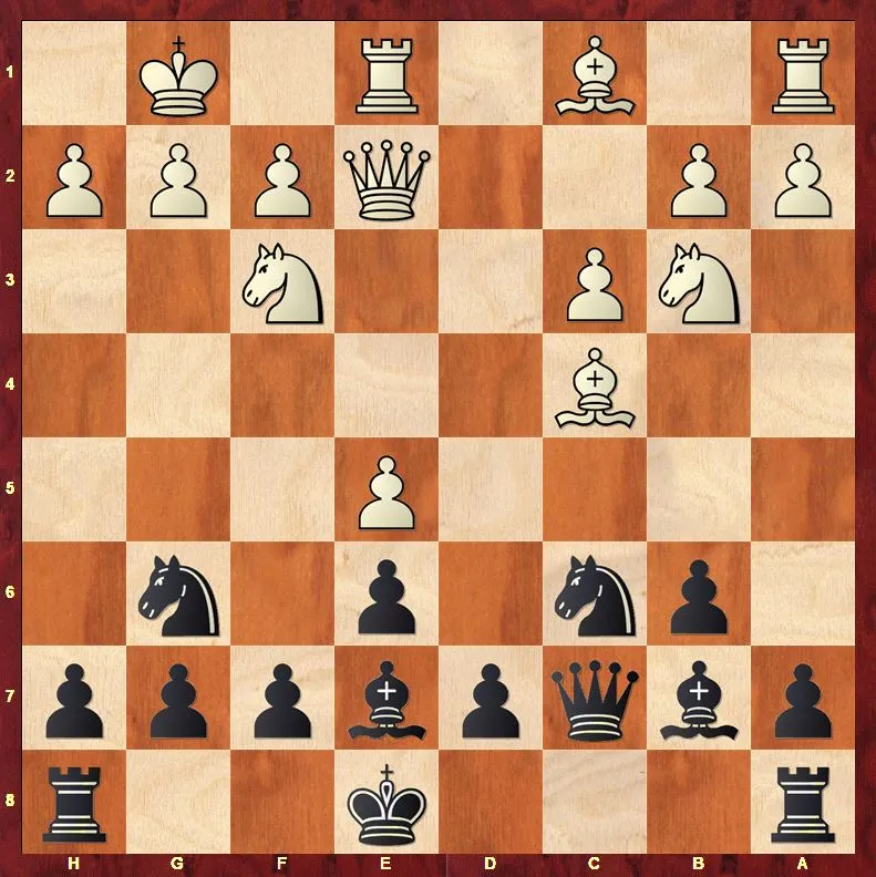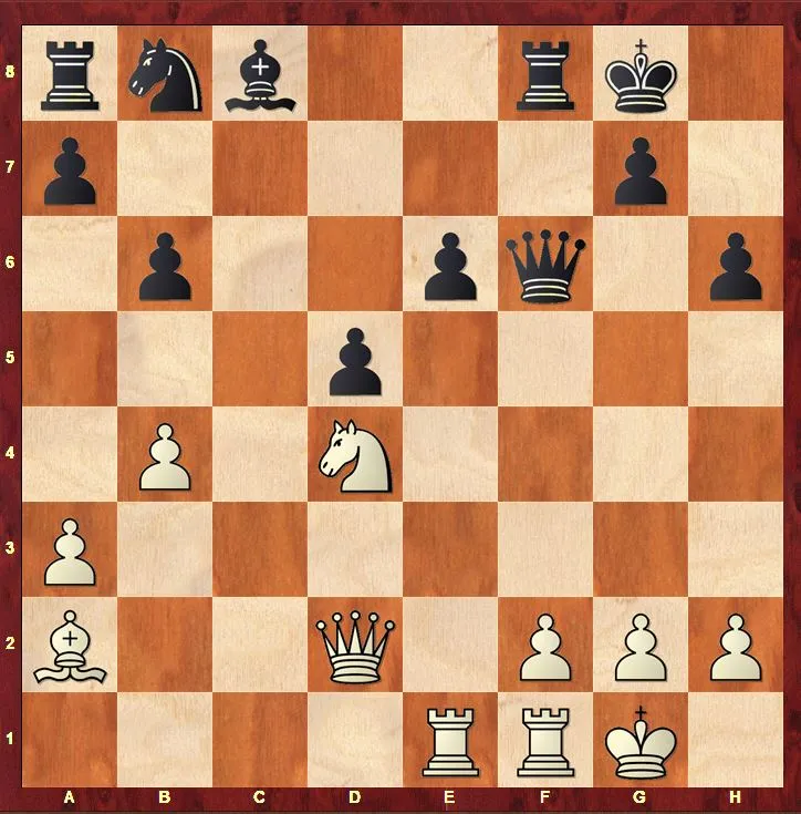 13...Scxe5!! I czarne uzyskują ogromną przewagę. Po 14. Sxe5 Sxe5 15. Hxe5 nadchodzi 15...Hxc4! I czarne nie tylko zyskały pionka, ale przede wszystkim parę gońców i potężnego gońca na b7. Niedługo wygrałam tę partię i...pomściłam męża ;)