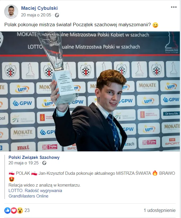 Swoją drogą zabawne jest jak bardzo lubimy słowo "sensacja". Janek jest tak dobrym graczem, że w jego przypadku nie ma już mowy o sensacjach - pokonanie dowolnego zawodnika na świecie, w dowolnym stylu, dowolnym tempie i dowolnym kolorem jest po prostu naturalną koleją rzeczy. To zawodnik celujący w ścisłą czołówkę światową i będący na wznoszącej fali. Do tego grający ambitnie i ciekawie, co sprawia, że jest bardzo chętnie zapraszany do kolejnych internetowych wydarzeń - czy to Nation's Cup czy teraz Lindores Abbey. To, rzecz jasna nie jest przypadek, ale ugruntowanie pewnej pozycji Janka. Działacze Polskie Związku Szachowego szeroko komentowali sukces Janka. I słusznie! Maciej Cybulski, wiceprezes ds. Marketingu i Promocji w PZSzach napisał na swoim profilu na Facebooku: