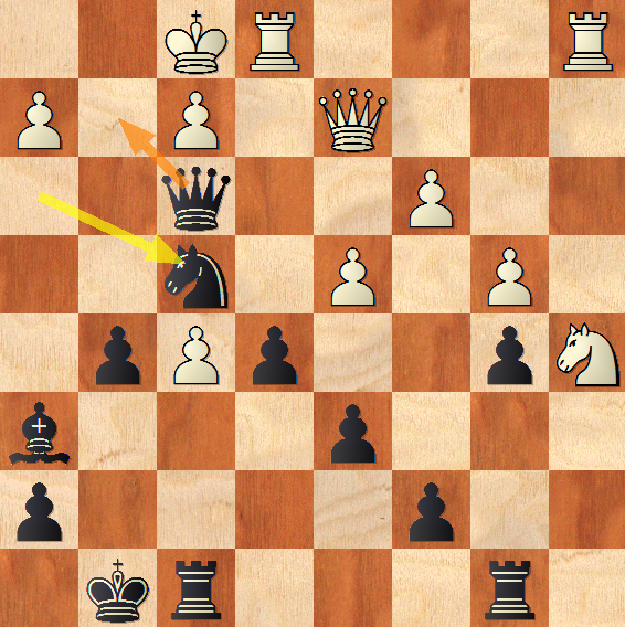 Na szachownicy piątej czekała nas duża niespodzianka: nasza Kasia rozgromiła przeciwną Kasię w bardzo efektownym stylu – pomimo faktu, że przeciwniczka górowała nad nią dwustoma oczkami rankingowymi – partia toczyła się praktycznie do jednej bramki (patrz diagram).