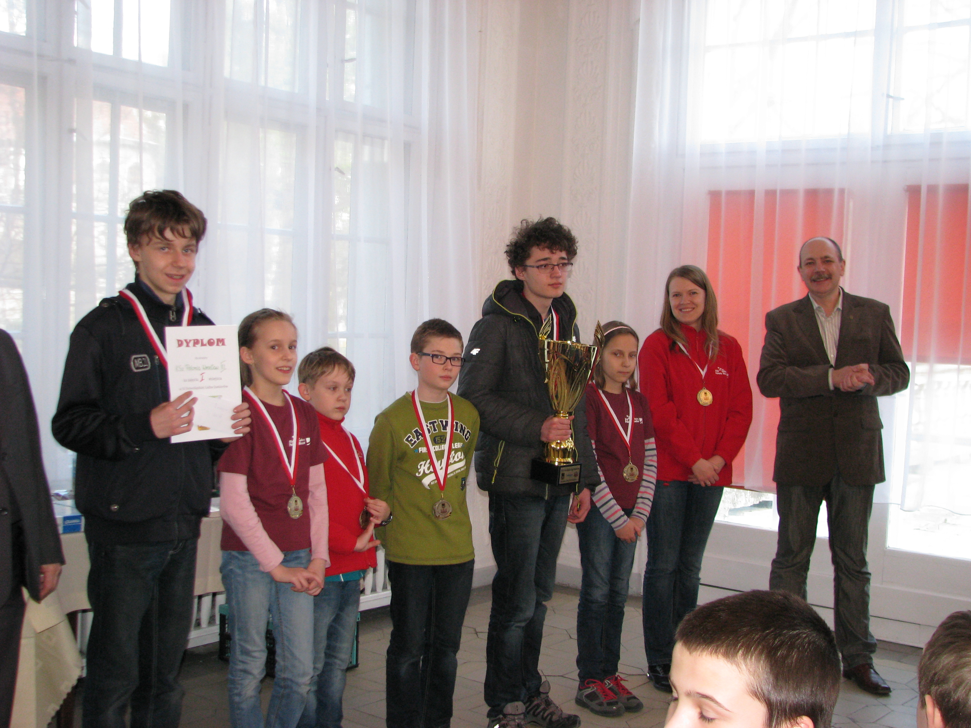 (Zwycięski skład Polonii, od lewej: Paweł Korolewicz, Anna Krzyżosiak, Wiktor Smyka, Marcin Borkowski, Józef Mastalarz, Marta Krzyżosiak, Paulina Cagara (trener), Dominik Kulaś (prezes DZSzach), zdjęcie: Rafał Krzyżosiak)
