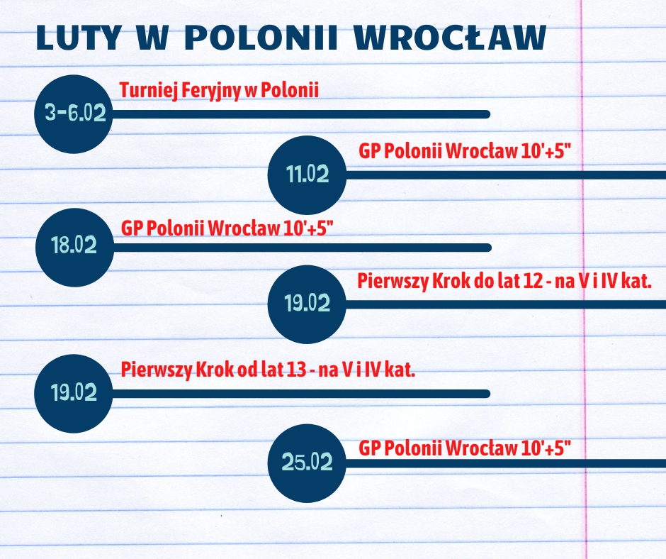 Zapraszamy na lutowe turnieje szachowe w naszym klubie! W naszych turniejach będzie można zdobyć wyższą kategorię szachową – V, IV, III, II oraz częściówkę na I kategorię! Nie zabraknie także turniejów liczonych do rankingu ELO w szachach klasycznych. Oczywiście w każdy (prawie każdy) piątek odbędzie się GRAND PRIX POLONII WROCŁAW! Więcej szczegółów poniżej!