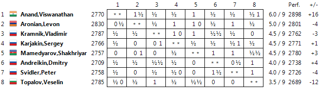 | Anand Viswanathan | ½-½ | Mamedyarov Shakhriyar |