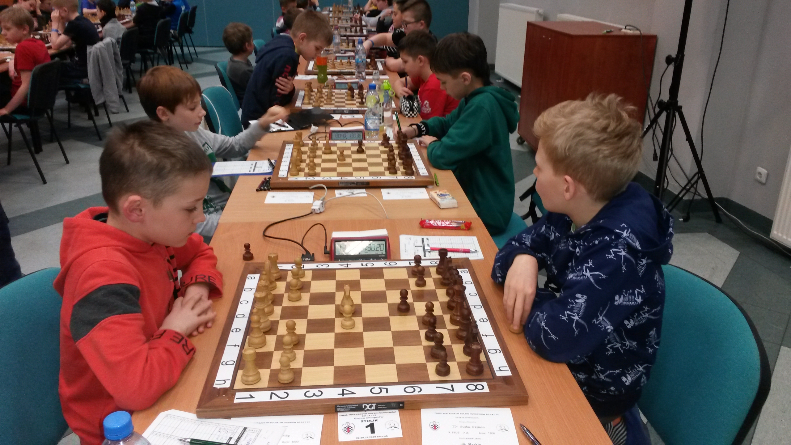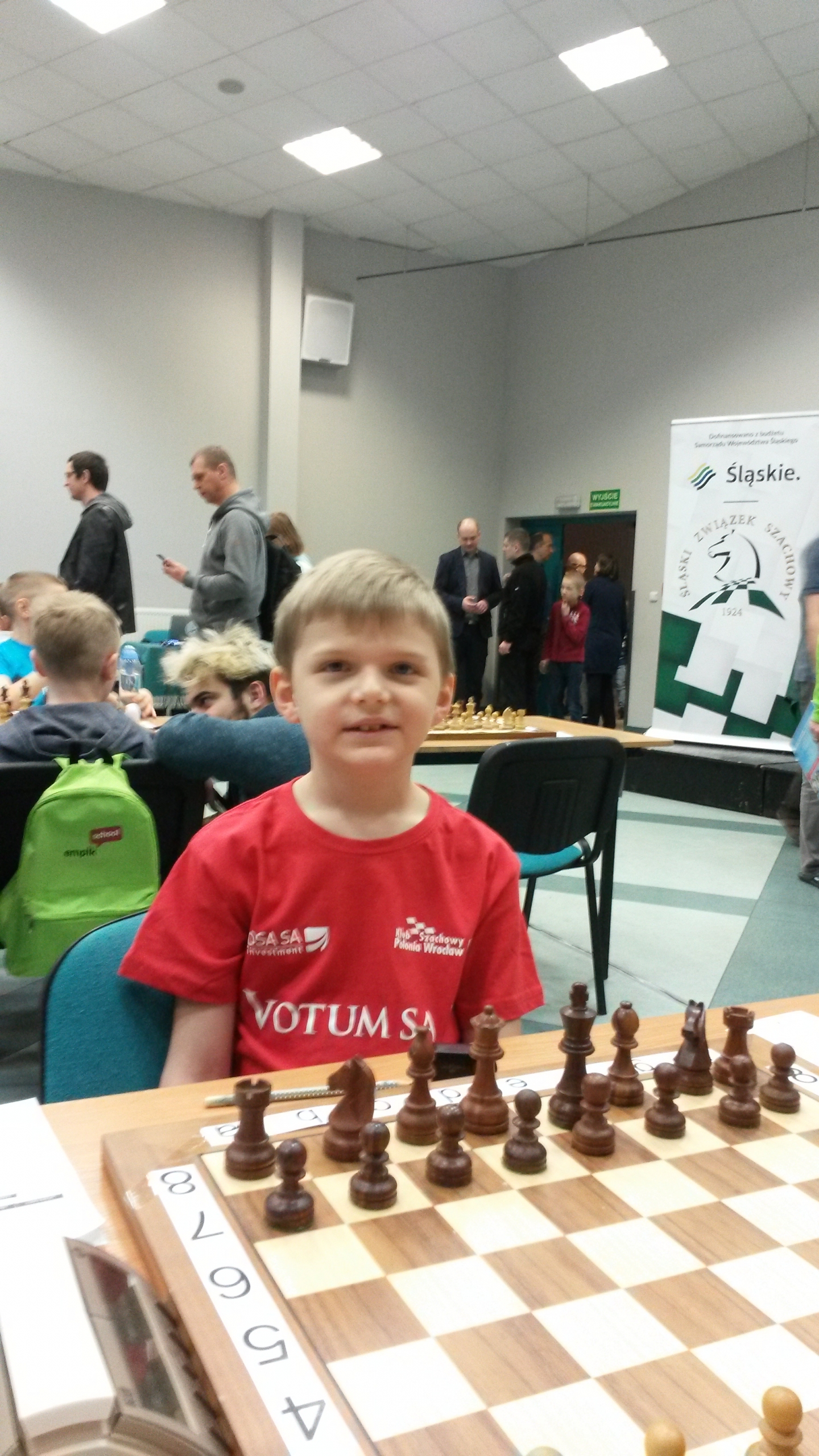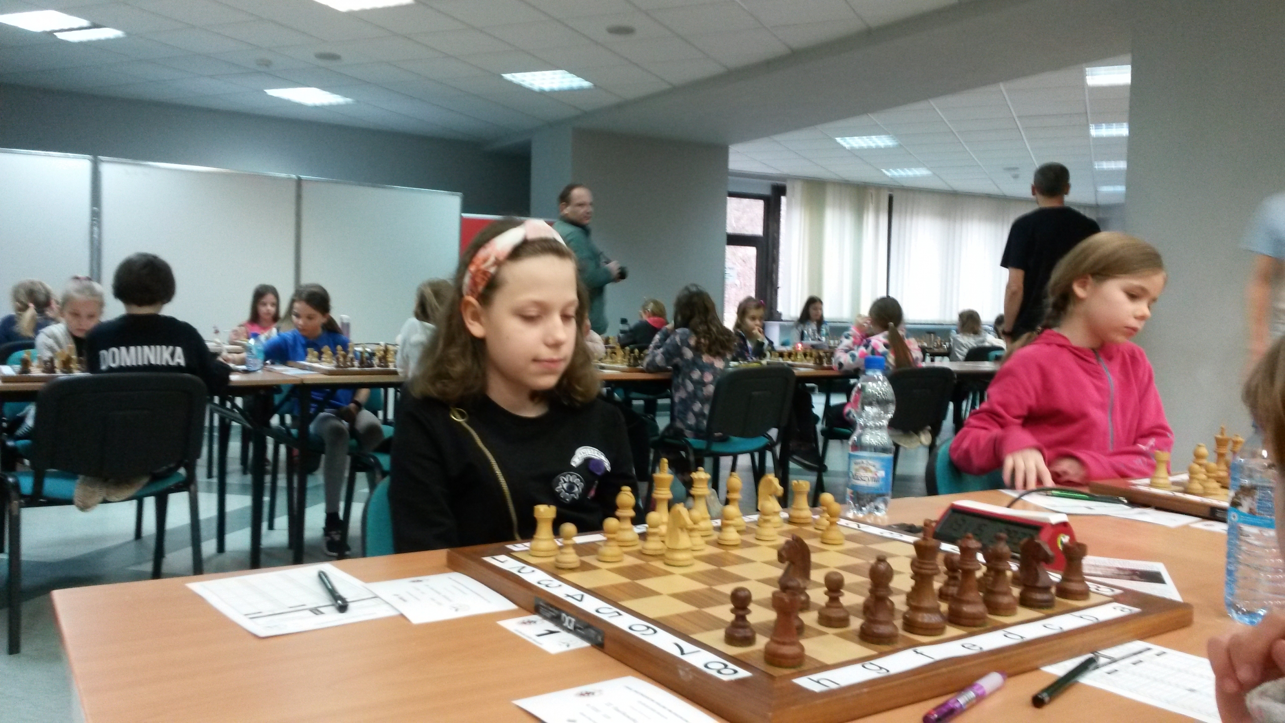 Za nami najcięższy dzień na turnieju – podwójna runda. Rano dokładnie powtórzyliśmy wynik z dwóch poprzednich dni robiąc 4 z 5 – ciągle wszyscy zostali z kompletem, niestety Krystian z kompletem porażek. Przeciwniczka Wiktorii stwierdziła, że będzie grała czarnymi na początku symetrycznie i w pierwszym ruchu, w którym zrezygnowała z symetrii zagrała źle i dostała bardzo słabą pozycję, co nasza zawodniczka pewnie wykorzystała. Maja od debiutu ruszyła do ataku na króla przeciwniczki, ale w pewnym momencie pozwoliła całkowicie zablokować swój i atak i przeciwniczce udało się skutecznie przeprowadzić kontratak na skrzydle hetmańskim. Pozycja naszej zawodniczki od tego momentu wisiała na włosku, ale przeciwniczka nie potrafiła zadać decydującego ciosu i w końcówce kompletnie się pogubiła dając Majce zwycięstwo. Filip, po ciekawym debiucie, zagrał długą 70-ruchową partię, ale wynik był jasny dużo, dużo wcześniej – przeciwnik nie chciał się poddawać i grał do mata. U Mikołaja figury wymieniały się szybko i zawodnicy przeszli do lepszej końcówki dla naszego zawodnika końcówki, w której polonista ograł swojego przeciwnika. Krystian zagrał swoją najlepszą jak do tej pory partię, ale to nie wystarczyło i ponownie przegrał.