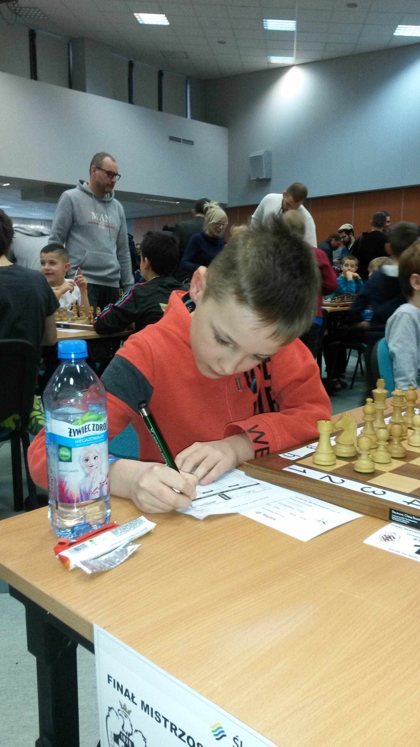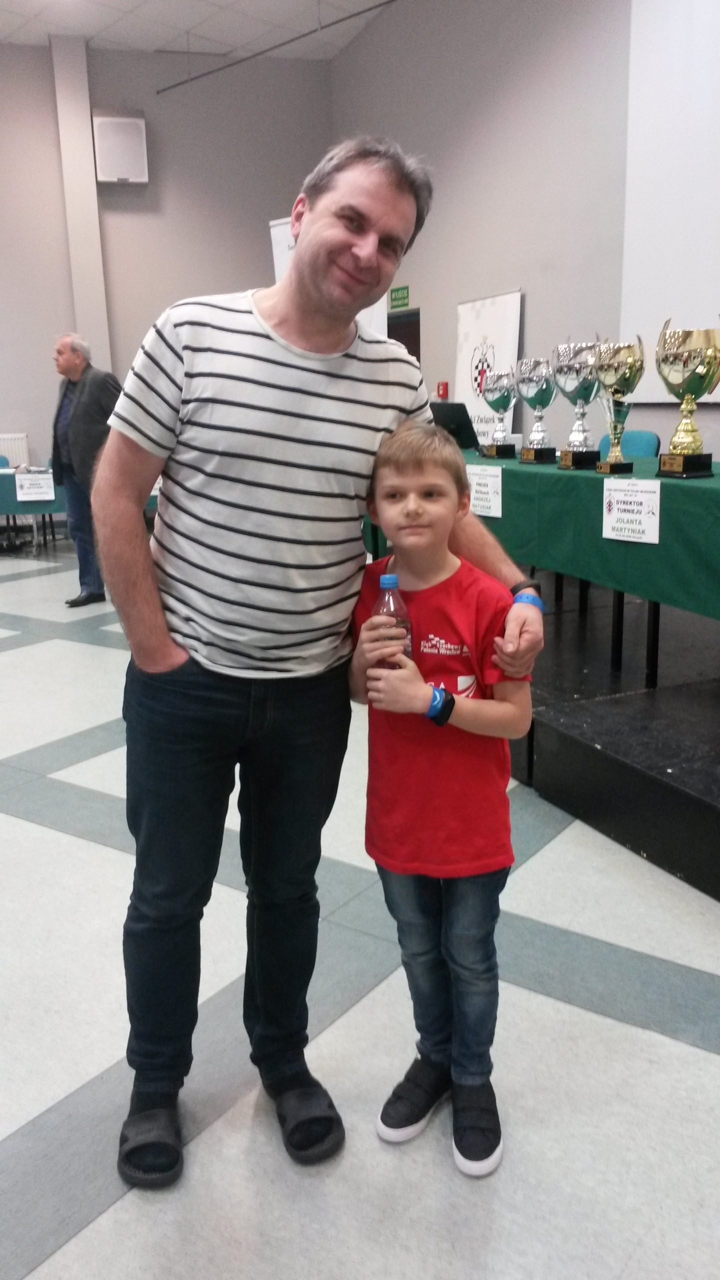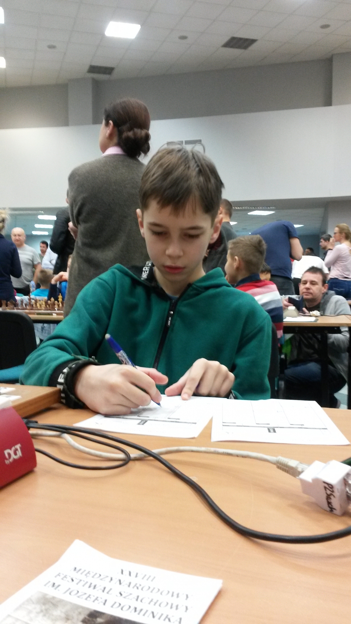Za nami najcięższy dzień na turnieju – podwójna runda. Rano dokładnie powtórzyliśmy wynik z dwóch poprzednich dni robiąc 4 z 5 – ciągle wszyscy zostali z kompletem, niestety Krystian z kompletem porażek. Przeciwniczka Wiktorii stwierdziła, że będzie grała czarnymi na początku symetrycznie i w pierwszym ruchu, w którym zrezygnowała z symetrii zagrała źle i dostała bardzo słabą pozycję, co nasza zawodniczka pewnie wykorzystała. Maja od debiutu ruszyła do ataku na króla przeciwniczki, ale w pewnym momencie pozwoliła całkowicie zablokować swój i atak i przeciwniczce udało się skutecznie przeprowadzić kontratak na skrzydle hetmańskim. Pozycja naszej zawodniczki od tego momentu wisiała na włosku, ale przeciwniczka nie potrafiła zadać decydującego ciosu i w końcówce kompletnie się pogubiła dając Majce zwycięstwo. Filip, po ciekawym debiucie, zagrał długą 70-ruchową partię, ale wynik był jasny dużo, dużo wcześniej – przeciwnik nie chciał się poddawać i grał do mata. U Mikołaja figury wymieniały się szybko i zawodnicy przeszli do lepszej końcówki dla naszego zawodnika końcówki, w której polonista ograł swojego przeciwnika. Krystian zagrał swoją najlepszą jak do tej pory partię, ale to nie wystarczyło i ponownie przegrał.