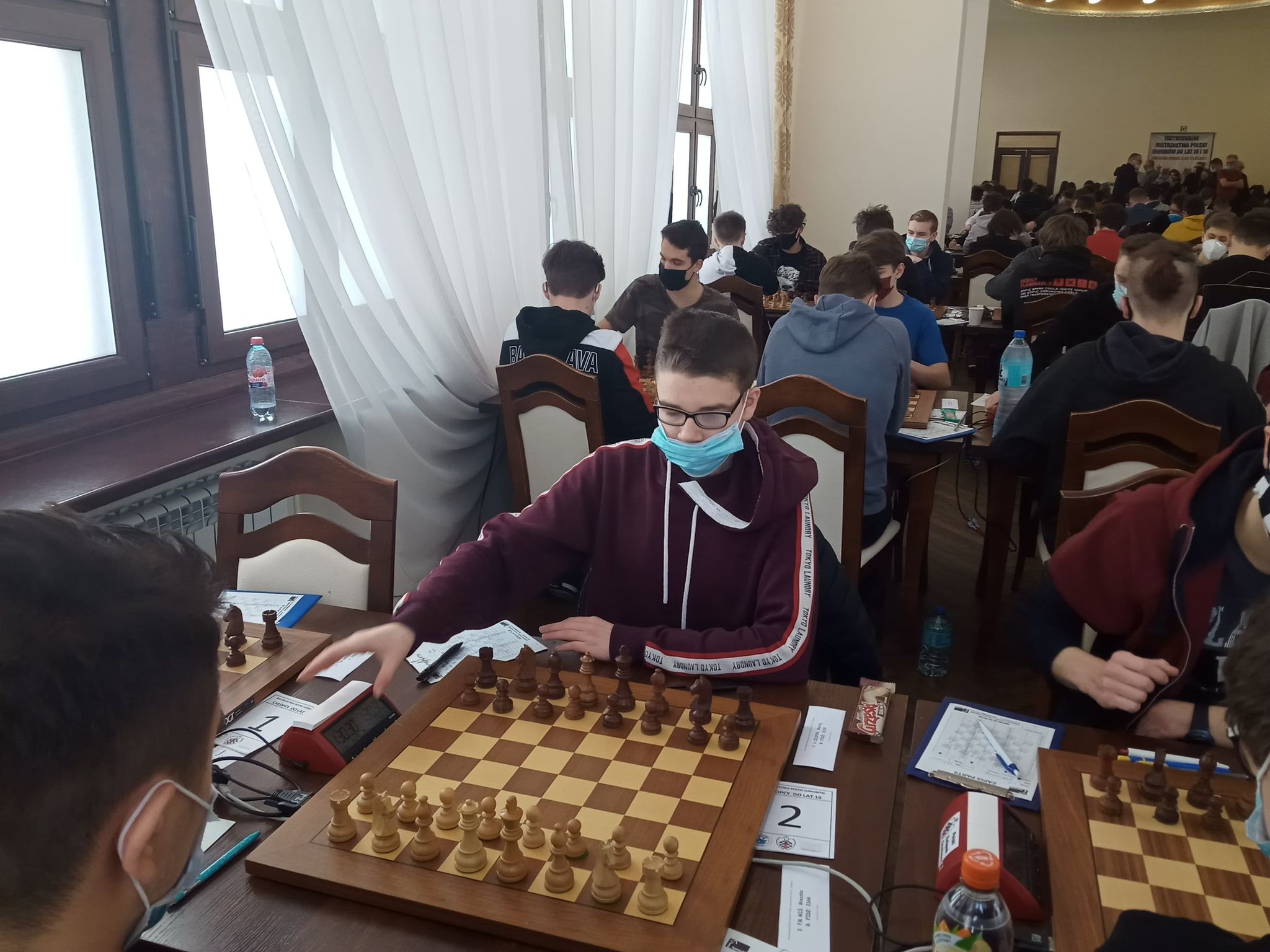 7. rudna tegorocznych MP juniorów starszych rozpoczęła się bardzo obiecująco, bowiem dosyć szybko wygrali swoje partie, i to jeszcze grając czarnymi, Kuba i Maciek. Kuba wybrał po raz pierwszy w swojej praktyce, modny ostatnio wariant z ruchem 9…h5 w obronie Caro-Cann, co niewątpliwie było sporą niespodzianka dla jego przeciwnika. Efekt zaskoczenia zrobił swoje. Białe nie tylko dopuściły do typowego dla tego wariantu motywu f5-f4-f3, ale również dały sobie złapać figurę, po błędnym 19. Ge4. Maciek bez problemów wyrównał, a po 16…d5 powoli zaczął przechwytywać inicjatywę. Jego przeciwnik okazał się być na tyle „uprzejmy”, że biorąc pionka na a5 pozwolił Maćkowi szybko zakończyć partię matowym atakiem. Grającemu w tej samej grupie wiekowej Michałowi nie udało się zamienić niewielkiej przewagi jaka osiągnął po debiucie, na coś bardziej konkretnego. Być może gdyby zamiast 15. Hd2 zagrał 15. Hf3, postawiłby większe problemy przed przeciwnikiem. A tak padł remis.