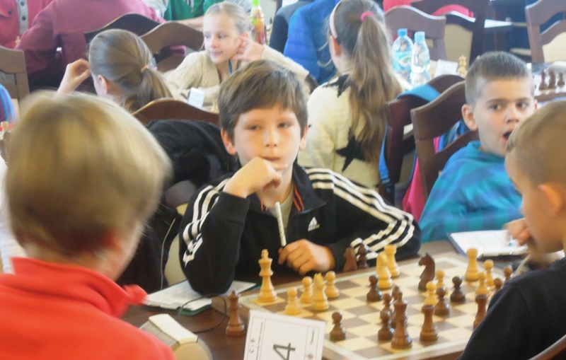 W 4 rundzie Mateusz wygrał ze Sławomirem Męczyńskim. W partii hiszpańskiej nasz zawodnik stworzył nacisk na skrzydle królewskim, po czym przeciwnik stracił jakość i Mateusz to zrealizował.