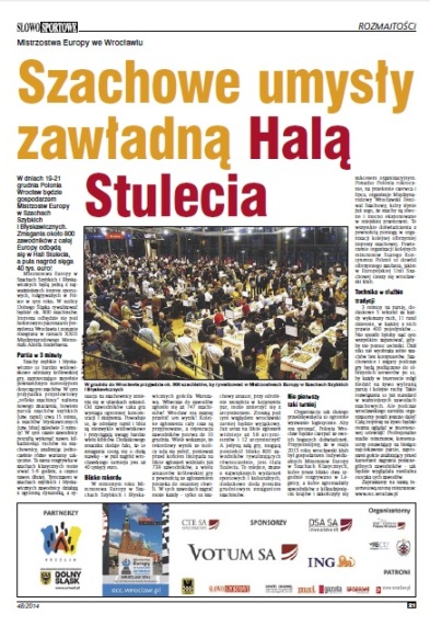 Zapraszamy do lektury najnowszego numeru tygodnika „Słowo Sportowe”, który dziś trafił do kiosków. Znajdziecie tam całą stronę poświęconą szachom, a w szczególności czekającym nas już za niecałe trzy tygodnie Mistrzostwom Europy w Szachach Szybkich i Błyskawicznych, które rozegrane zostaną we wrocławskiej Hali Stulecia. Zapraszamy!