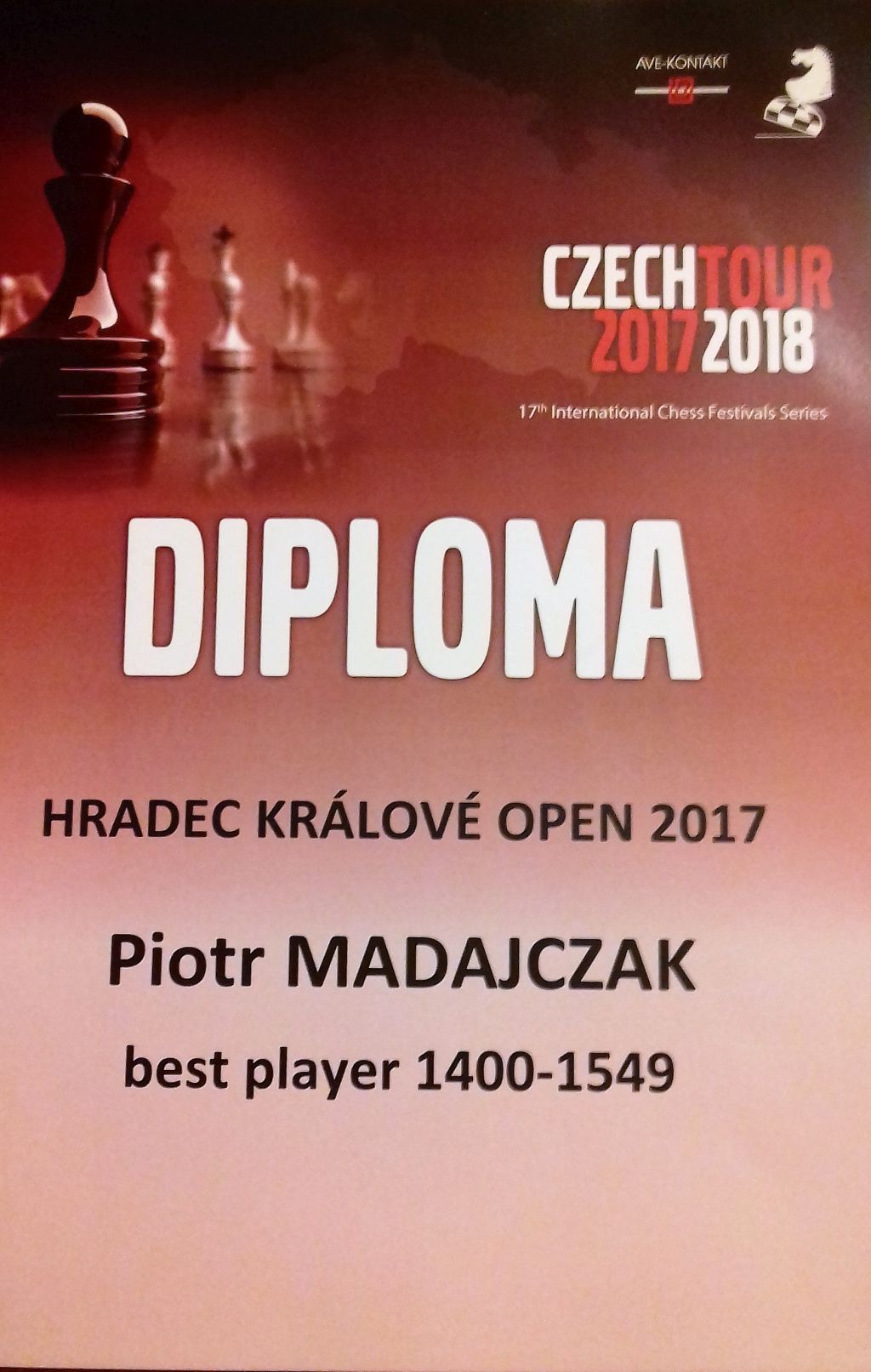 Turniej w Hradcu Kralove, który został rozegrany w dniach 1-8.10.2017, na dystansie 9 rund granych tempem 90 minut + 30 sekund na posunięcie na zawodnika, zagrało 83 zawodników. W zawodach wystąpiło pięcioro zawodników naszego klubu: Maciej Świcarz, Janusz Żochowski, Wiktoria Śmietańska, Piotr Madajczak oraz Tymon Jaworski. Łącznie nasi zawodnicy zarobili na rankingu ELO, aż 439,8 pkt!!!