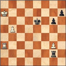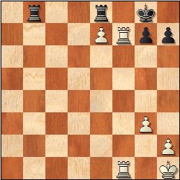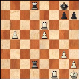 Programy komputerowe są bardzo optymistycznie nastawione do szans białych w powstającej pozycji, ale rozwiązanie to jest absolutnie niepraktyczne z czysto ludzkiego punktu widzenia – białe maja już tylko jednego piona więcej, mobilność ich wież jest znacznie ograniczona, a każda próba wzmocnienia pozycji poprzez wprowadzenie króla do gry skończy się szantażem szachowym ze strony czarnej wieży na b8. Przede wszystkim jednak takie rozwiązanie byłoby sprzeczne z podstawowa zasada końcówek technicznych – nie forsować wydarzeń na siłę!] 42…W8xd6 43.exd6 Wxd6 44.Kg2! Diagram