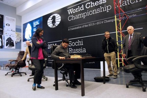 W dniach 7-28.11.2014 w Soczi (Rosja) odbędzie się mecz o mistrzostwo świata pomiędzy aktualnym mistrzem Norwegiem Magnusem Carlsenem, a zwycięzcą turnieju kandydatów z Chanty-Mansyiska z 2014 r., 5-krotnym mistrzem świata, hindusem Viswanathanem Anandem, który panował na tronie szachowym od 2007 r.